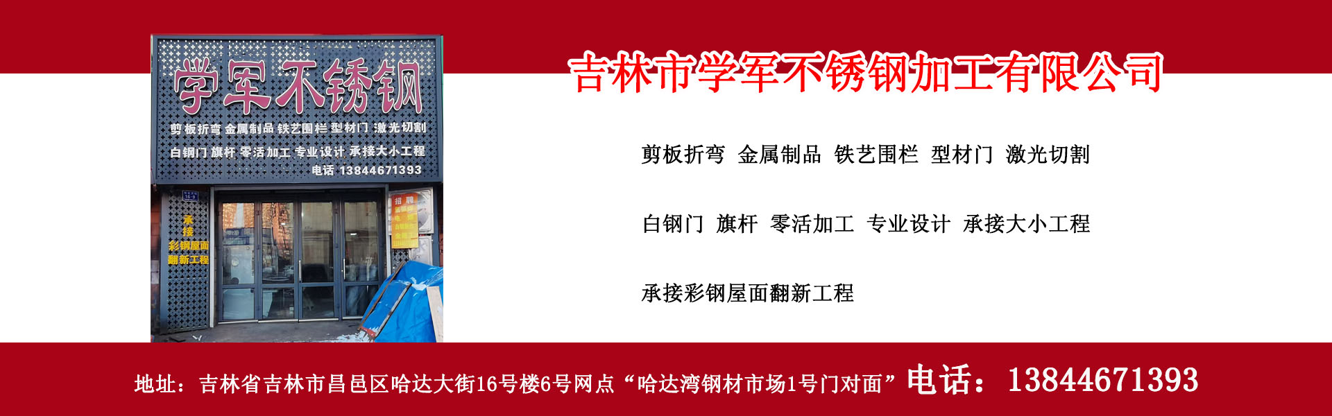吉林市學(xué)軍不銹鋼加工有限公司專業(yè)從事吉林市不銹鋼加工制作、吉林市白鋼門(mén)制作、吉林市白鋼隔斷制作、吉林市剪板折彎、激光切割、型材門(mén)、電子感應(yīng)門(mén)、旗桿制作、彩鋼屋面翻新、吉林市鐵藝圍欄加工制作等吉林市不銹鋼加工制作、吉林市金屬加工制作服務(wù)單位,位于吉林省吉林市。